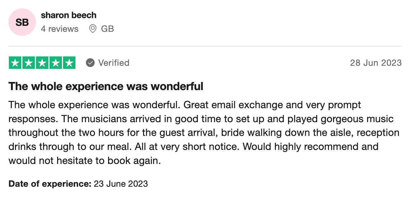 Feedback från våra brudpar är kärnan i Young Musicians For Hire. Deras berättelser vittnar om vår förmåga att leverera enastående musikaliska upplevelser som förhöjer deras speciella dag. Från intima ceremonier till storslagna mottagningar, varje recension understryker vår anpassningsförmåga och engagemang för att göra varje bröllop unikt och minnesvärt.